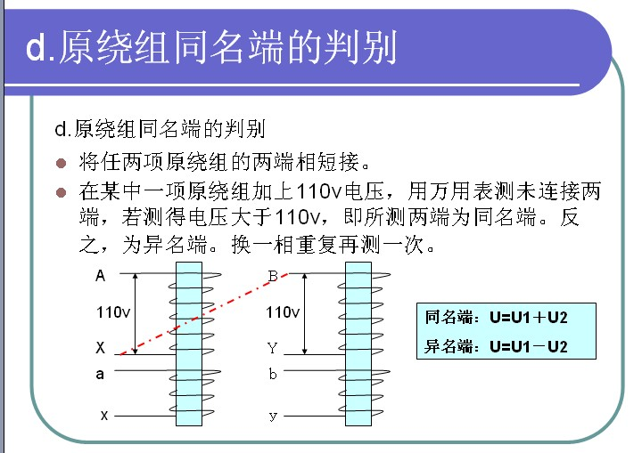 在某相原繞組施加110v電壓,測(cè)定三個(gè)付繞組中感應(yīng)電勢(shì),感應(yīng)電勢(shì)最大的一組付繞組就是該項(xiàng)繞組的付繞組。